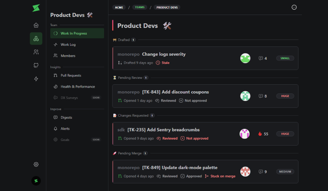 We’ve added a new Work In Progress view to make it easier to keep track of your team’s open PRs. This screen shows all PRs grouped by status: Draft, Pending Review, Changes Requested, and Pending Merge.