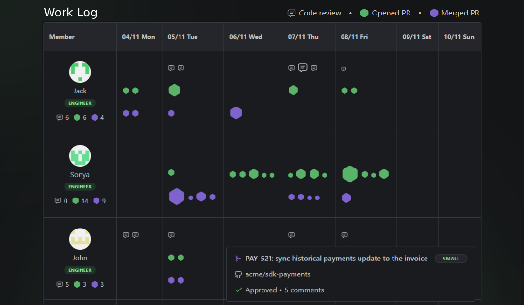 The Work Log is not intended to measure individual productivity. It only reflects activity related to PRs and code reviews. It doesn’t account for essential work outside of code contributions, like planning, meetings, research, or documentation.