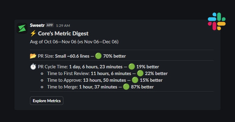 💡 This should help teams keep an eye on their delivery and understand how they are improving over time, without leaving Slack.