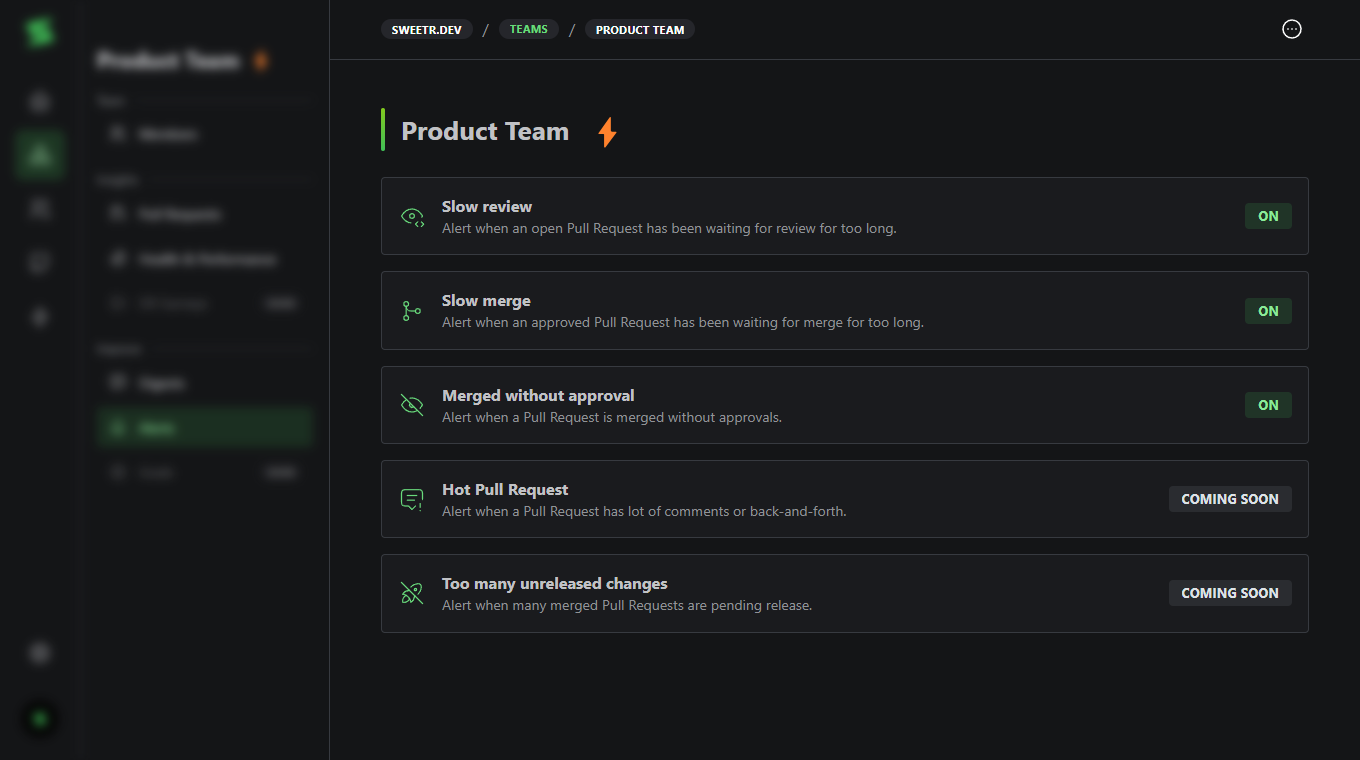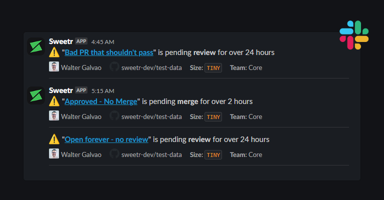 Slow Merge Alerts – Stay informed if an approved pull request hasn’t been merged within your defined period.